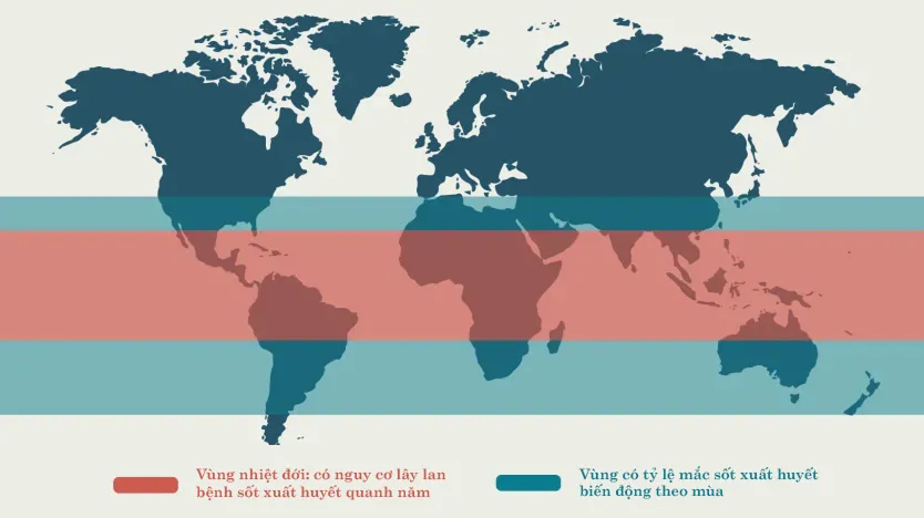Hiện nay, các khu vực nhiệt đới có nguy cơ lây lan bệnh sốt xuất huyết quanh năm. Tuy nhiên, các khu vực xung quanh vùng nhiệt đới thường có tỷ lệ mắc sốt xuất huyết biến động hơn theo mùa. Do trái đất đang nóng lên, dịch sốt xuất huyết có nguy cơ tiếp tục lan rộng trên toàn cầu.8,9 Nhiệt độ tăng cao có thể làm tăng số lượng muỗi vằn bằng cách thúc đẩy khả năng sống sót và sinh sôi của chúng.9